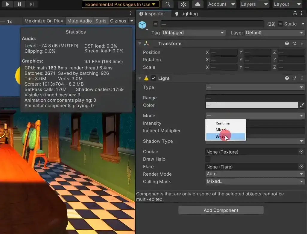 OK, so the second option would be to bake to these lights so we don’t run these expensive calculations in real-time that are killing draw call batching.